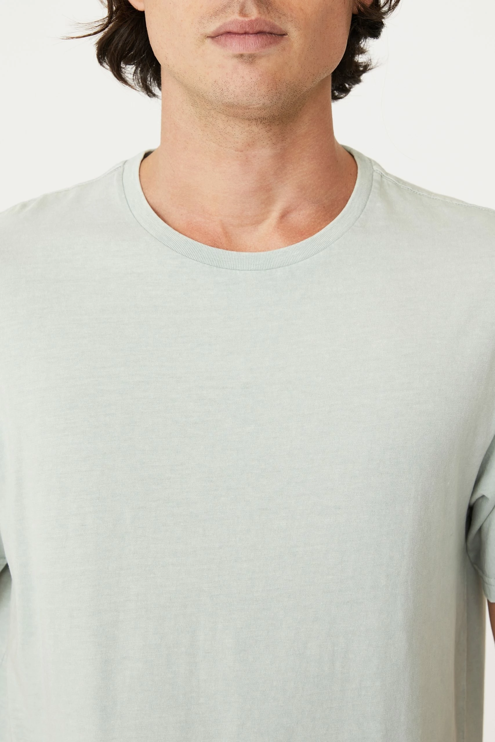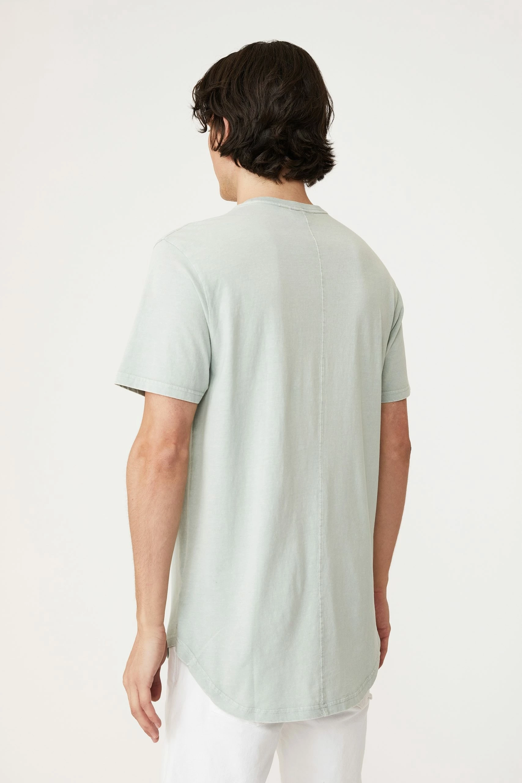 A fashion fit with a scoop hem and extended length in the body. Tuck it in or wear it over chinos and denim. It’s made from 180gsm sustainably sourced cotton. The heavier weight gives it a premium feel without the price tag.